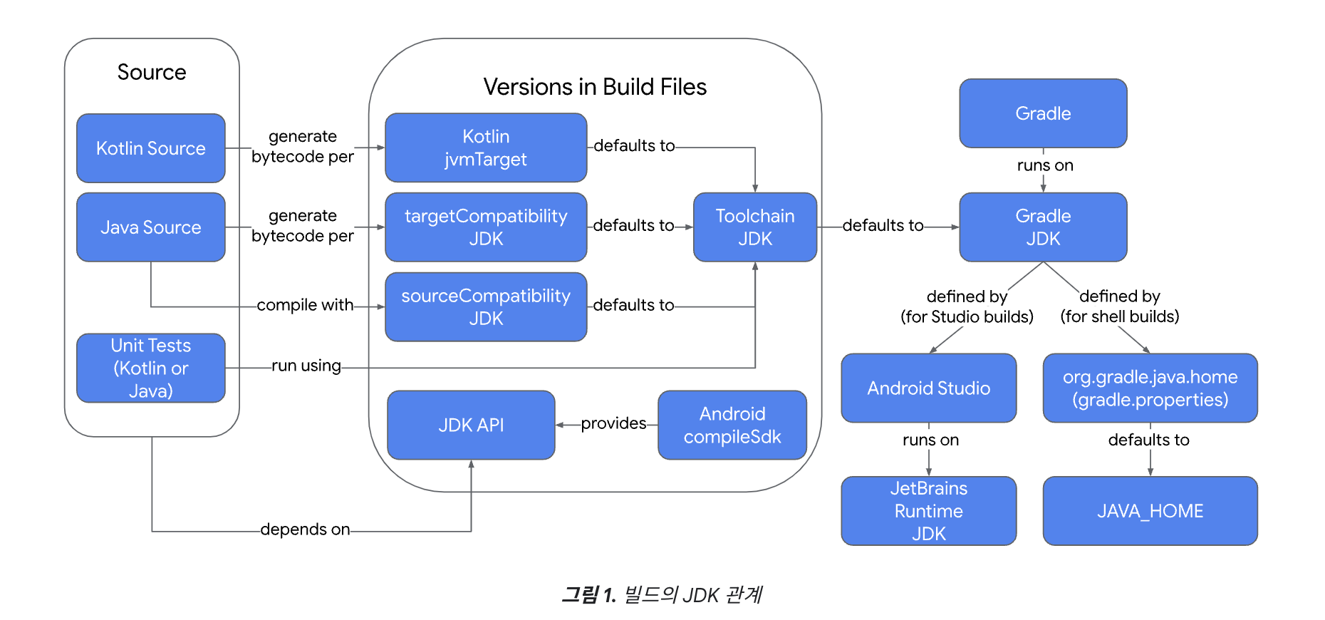 우리는 앱 빌드를 위해 JDK 또는 Java 언어 버전을 여러 곳에서 선택해야한다. `compileOptions` 와 `kotlinOptions` 을 이용하여 Java 버전과 `JVM` 버전을 설정해주는 과정을 먼저 살펴보고, Kotlin과 Java 소스코드가 Gradle 빌드 도구로 JDK 실행환경에서 작동하는 과정을 정리한다. 또 `Gradle JDK`는 어떻게 정의될 수 있는지 그 관계까지 알아본다.